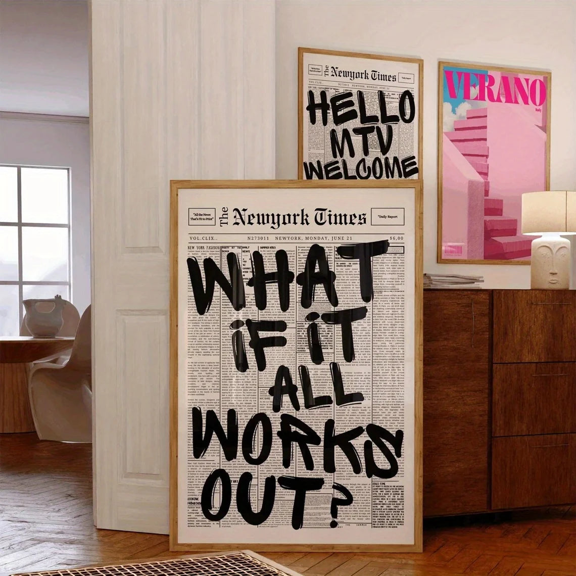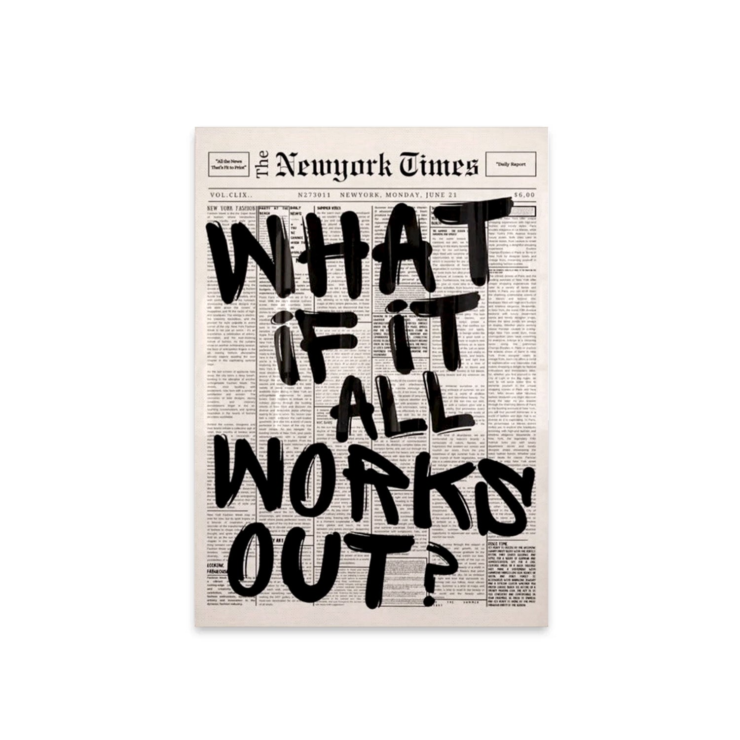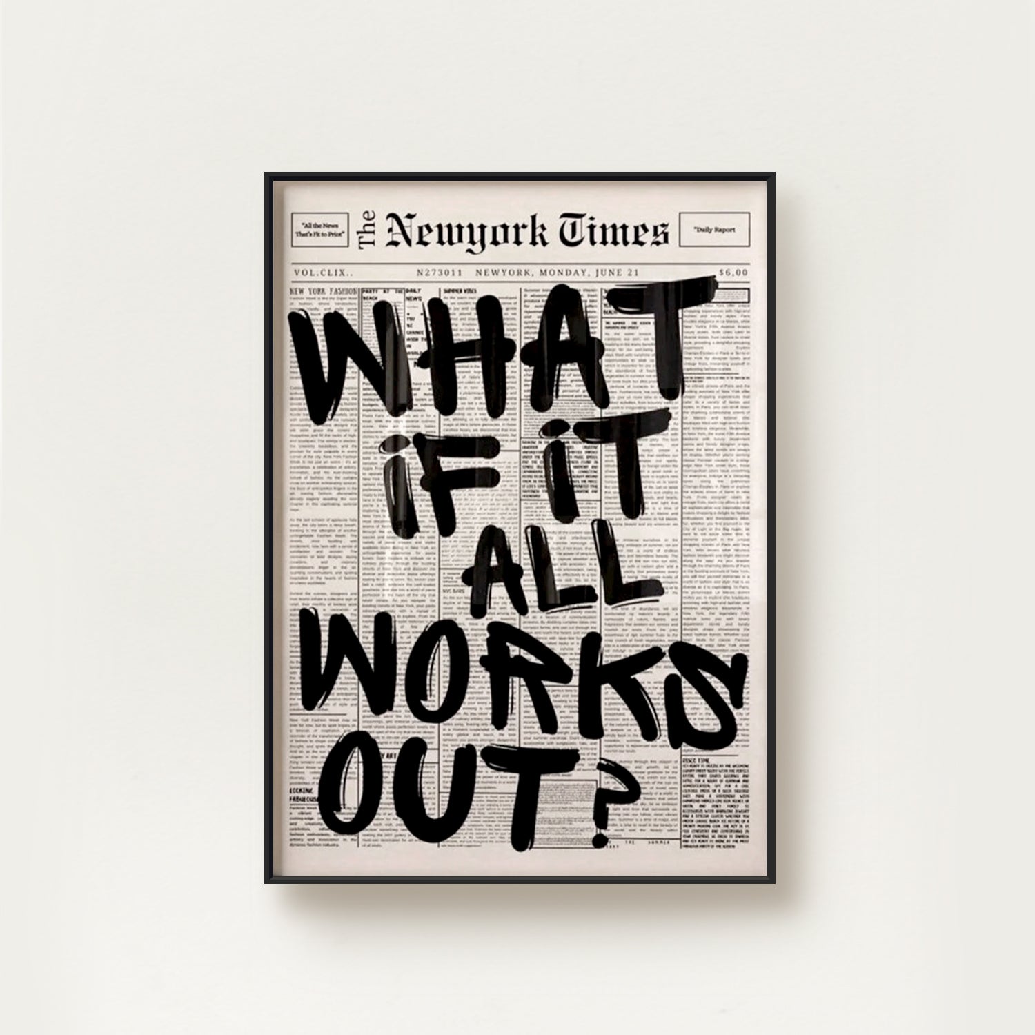 What If Everything Goes Well turns doubt on its head with bold optimism. Set against a vintage-style newspaper backdrop, the hand-painted message disrupts the noise with a single radical thought: hope. Raw, graphic, and uplifting, this piece is a reminder that sometimes, things can actually go right. A statement print for walls that need both edge and encouragement.