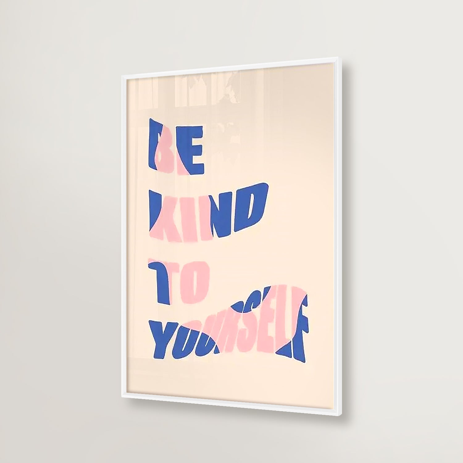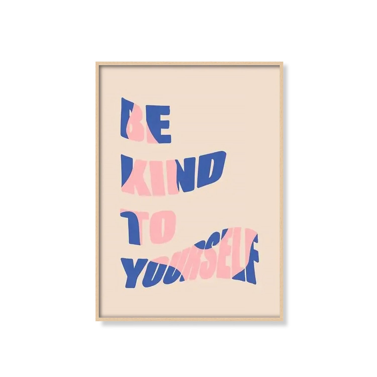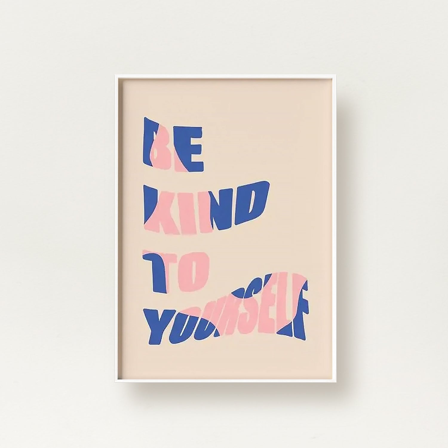 "Gentle words with a bold look—'Be Kind To Yourself' pairs calming blue with striking pink for a contrast that catches the eye and soothes the soul. A modern reminder to slow down, breathe, and treat yourself with the care you deserve. Perfect for creating a soft, empowering vibe in any space."